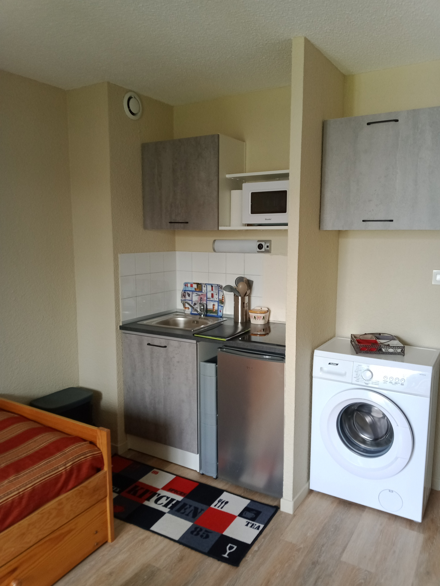 Port Olona, La Chaume, au 1er étage d'une résidence face à un parc, studio meublé d'une surface de 16.21 m2 composé d'une pièce de vie avec coin cuisine équipée et aménagée (plaque de cuisson, réfrigérateur, machine à laver),salle d'eau/wc et loggia.DPE : D